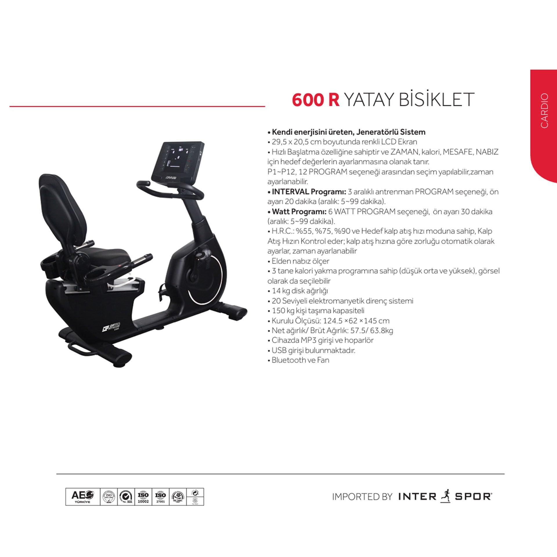H.R.C.: %55, %75, %90 ve hedef kalp atış hızı moduna sahip, kalp atış hızını kontrol eder; kalp atış hızına göre zorluğu otomatik olarak ayarlar, zaman ayarlanabilir