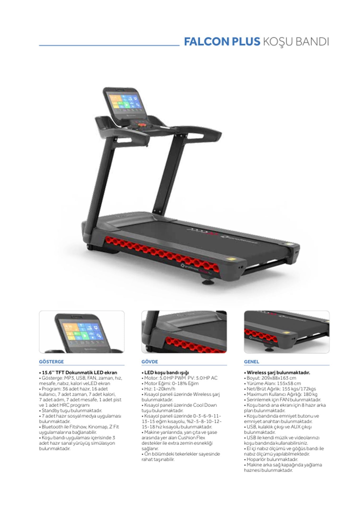 Zemin Özelliği: Makine yanlarında, yan çıta ve şase arasında yer alan Cushion Flex destekler ile extra zemin esnekliği sağlanır.Gösterge Bilgileri: "15.6’’ TFT Dokunmatik LED ekran" MP3, USB, FAN, zaman, hız, mesafe, nabız, kalori ve LED ekran
