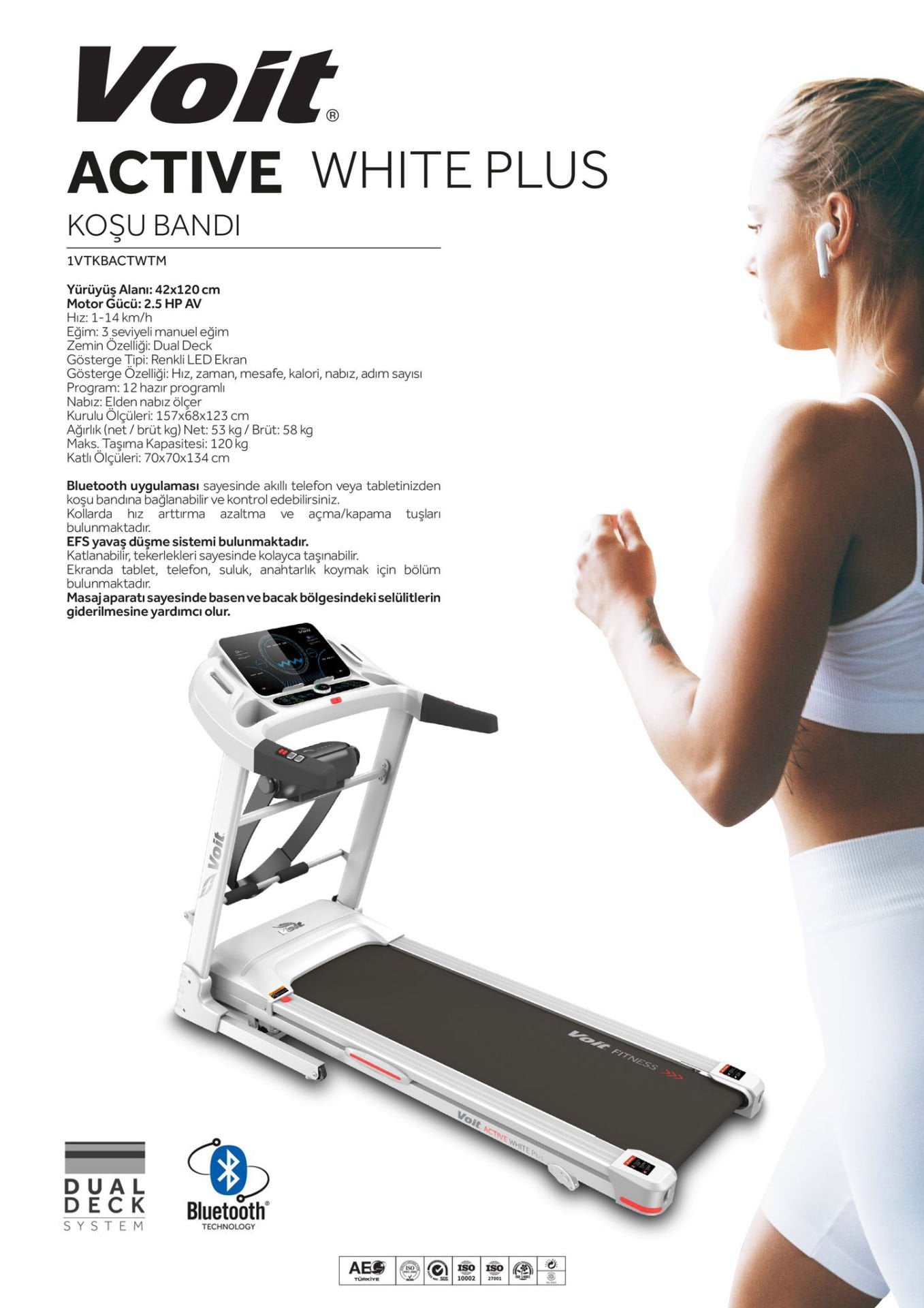 Bluetooth uygulaması sayesinde akıllı telefon veya tabletinizden koşu bandına bağlanabilir. Kollarda hız arttırma azaltma ve açma/kapama tuşları bulunmaktadır.
