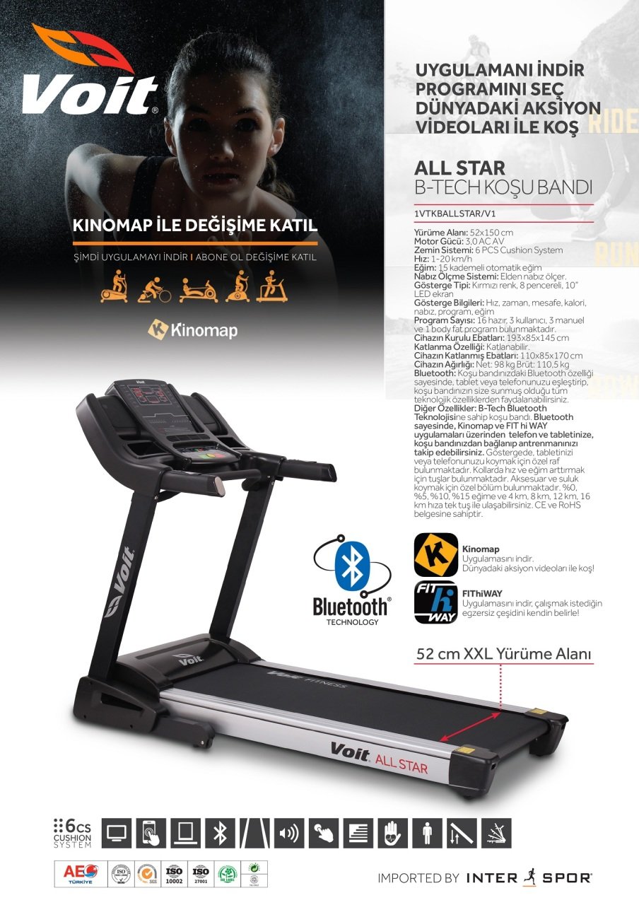 Kollarda hız ve eğim arttırmak için tuşlar bulunmaktadır. Aksesuar ve suluk koymak için özel bölüm bulunmaktadır. %0, %5, %10, %15 eğime ulaşabilirsiniz. CE ve PoHS belgesine sahiptir. Haparlör, MP3, kulaklık ve USB girişi bulunmaktadır. Bluetooth bağlantısı sayesinde telefonunuzdan veya tabletinizden müzik dinleyebilirsiniz.