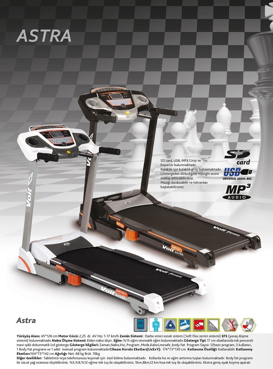 Voit Astra Koşu Bandı Ürün Özellikleri: Yürüyüş Alanı: 45x126 cm Motor Gücü: 2,25 dc AV hız: 1-17 km/h Zemin Sistemi: Darbe emici esnek sistem (Soft Flex zemin sistemi) EFS (Yavaş düşme sistemi) bulunmaktadır. Nabız Ölçme Sistemi: Elden nabız ölçebileceğiniz bir koşu bandıdır. Eğim: %15 otomatik eğim bulunmaktadır. Gösterge Tipi: 17 cm ebatlarında tek pencereli mavi ışıklı dokunmatik LCD göstergesi vardır. Gösterge Bilgileri: Zaman, Nabız, Hız, Program, Mode, Kalori, Mesafe, Bodyfat bilgilerine ulaşabilirsiniz. Program Sayısı: 12 adet hazır, 3 adet kullanıcı programı vardır. Cihazın Kurulu Ebatları: 174x73x130 cm Katlanma Özelliği: Katlanabilir Katlanmış Ebatları: 104x73x142 cm Ağırlığı: Net: 68 kg Brüt 76 kg Diğer Özellikler: Koşu bandında tabletinizi veya telefonunuzu koymak için özel bölme bulunmaktadır. Kollarda hız ve eğim arttırma tuşları bulunmaktadır. Body fat programı ile vücut yağ oranını ölçebilirsiniz. %5, %8, %12 eğime tek tuş ile ulaşabilirsiniz. 5km, 8km, 12km hıza tek tuş ile ulaşabilirsiniz. Ekstra geniş ayak koyma aparatı mevcuttur. Koşu bandı alırken en çok dikkat edilmesi gereken husus koşu bandının esnek bir zemine sahip olmasının gerektiğidir. Eğer sert zeminli bir koşu bandı tercih edilirse bacaklarınızda sakatlık meydana gelebilir. Buna ek olarak esnek zeminli koşu bandında koştuğumuz zaman zeminin yapısına örnek vermek gerekirse; toprakta koşmak, çimde koşmak hatta esnek bir tahta üzerinde koşmak gibi örnekler verebiliriz. Bu nedenle koşu bandı satın alacak kişilerin esnek zeminli koşu bantlarını tercih etmesi gerekir çünkü esnek zemine sahip olmayan cihazlar eklemlerimize zarar verir ve kalıcı rahatsızlıklara sebebiyet verebilir. Eğer esnek zemine sahip olmayan bir koşu bandı satın alırsanız karşılaşacağınız bir takım problemleri şöyle sıralayabiliriz; - Ayak rahatsızlıkları - Bilek ve kıkırdak rahatsızlıkları - Kas rahatsızlıkları - Omurilik rahatsızlıkları - Kalça rahatsızlıkları - Sırt ağrıları Multiflex Zemin Sistemi: Koşu bandı seçerken Multishock zemin sistemi olan bir yürüme bandı seçmek en önemli kriterlerin başında gelmektedir. Multi-Shock sistem eklemlerinizin zarar görmesini engelleyen bir sistem olup bu doğrultuda oluşturulmuştur. Bu sistem sayesinde dış mekanlarda (örneğin asfalt zeminde) koşmak yerine sağlığınız açısından son derece güvenli bir şekilde evinizin rahatlığında koşu bandında koşma ya da yürüme işlevini yerine getirirsiniz. Multishock, size en uygun koşu hareketlerini sağlamak için 4 farklı esneklik seçeneği sunan bir sistemdir. Koşu bandında koşma işlevini yerine getirirken bulunduğunuz zemine ağırlığınız kadar baskı uygularsınız. Eklemlere uygulanan bu baskı sizin hızlı şekilde yorulmanızı sağlayacağı gibi eklemlerinize de zarar verecektir. Bahsettiğimiz eklem baskısı problemini sona erdirmek için Multishock sistemi vasıtasıyla gerek eklemlerinize gerekse ayak bilekleriniz ve dizlerinize daha az baskı uygulayarak darbelerin absorbe edilmesini sağlayabilir ve en uygun egzersiz için en doğru tampon seviyesini ayarlayabilirsiniz. Multi-Shock yönetim butonunu kullanarak yürüme, yavaş tempoda koşma, hızlı koşma , çok hızlı koşma gibi farklı egzersizler için gerekli olan esnekliği sağlayabilirsiniz. Bunun için koşu bandı panelinde bulunan butonu 4 farklı kademeden sizin için en uygun olanına getirmeniz yeterlidir. Kademeler ne anlama gelir: hafif (siyah renkli kademe ), orta hafif (sarı renkli kademe), orta zor (lacivert renkli olan kademe), zor (kırmızı renkli olan kademe). Dual Deck Zemin Sistemi: Siz koşu bandında koşma eylemini gerçekleştirirken ayağınız zeminle her temas ettiğinde hem dizleriniz, hem kalçanız, hem de bir çok ekleminiz bu darbe esnasında gerilmek sebebiyle rahatsızlık duyacaktır. Bu rahatsızlıkta sizin yorulmanıza neden olacak ve yaptığınız sporun kalitesini düşürecektir. İşte Dual Deck teknolojisi tam olarak burada devreye girmektedir. Koşu bantları platform tasarımlarında çığır açmış olan bu teknoloji sayesinde ayağınız daha yere temas ettiği esnada absorbsiyon (emilme ve sindirme) meydana getirmekte ve arkadan yere çok daha sağlam ve güvenli basmanızı sağlayarak dengenizi muhafaza etmenizi sağlar. Bu da çok daha keyifli ve konforlu bir spor demektir. İonizer Zemin Sistemi: Voit yine son derece faydalı ve işlevsel bir zemin teknolojisi ile karşınızda. İonizer adı verilen bu teknoloji, koşu bandında yaptığınız koşuyu çok daha sağlıklı ve keyifli kılmak için oluşturulmuş ve voit koşu bantlarına entegre edilmiştir. İonizer teknolojisi ile, kapalı ortamda koşu bandında koşarken bile dışarıya üflediği hava sirkülasyonu sayesinde sizi ferahlatır ve sağlıklı bir ortamda koşarak sporunuzu daha verimli yapmış olursunuz. İonizer teknolojisinin çalışma prensibi, salgıladığı hava sirkülasyonu neticesinde yaydığı iyonlar kan basıncınızın düşmesini sağlaması üzerine kuruludur. Bu sayede spor yaparken artan kan basıncınızı dengelemiş olursunuz. İyonizer teknolojisinin ortama yaydığı negatif iyonlar vasıtasıyla tabiattaki negatif iyon yoğunluğundan meydana gelen taptaze havayı evinizde solursunuz. Reflex System (Yaylı Esnek Zemin): Koşu bantlarında koşarken tüketiciler yürüyüş bandının çok daha rahat olmasını ve koşarken ya da yürürken tam anlamıyla güvenli olmasın isterler. Voit ise bu konuda REFLEX SYSTEM adı verilen (YAYLI ESNEK ZEMİN) teknolojisini geliştirmiştir. Bu teknoloji siz koşu bandınızda koşarken size maksimum güveni sağlamak için tasarlanmıştır. Reflex System Nasıl Tasarlanmıştır? Nasıl bir mekanizmadan oluşur? Kişilerin ağırlıklarının değişkenliği göz önüne alınarak far