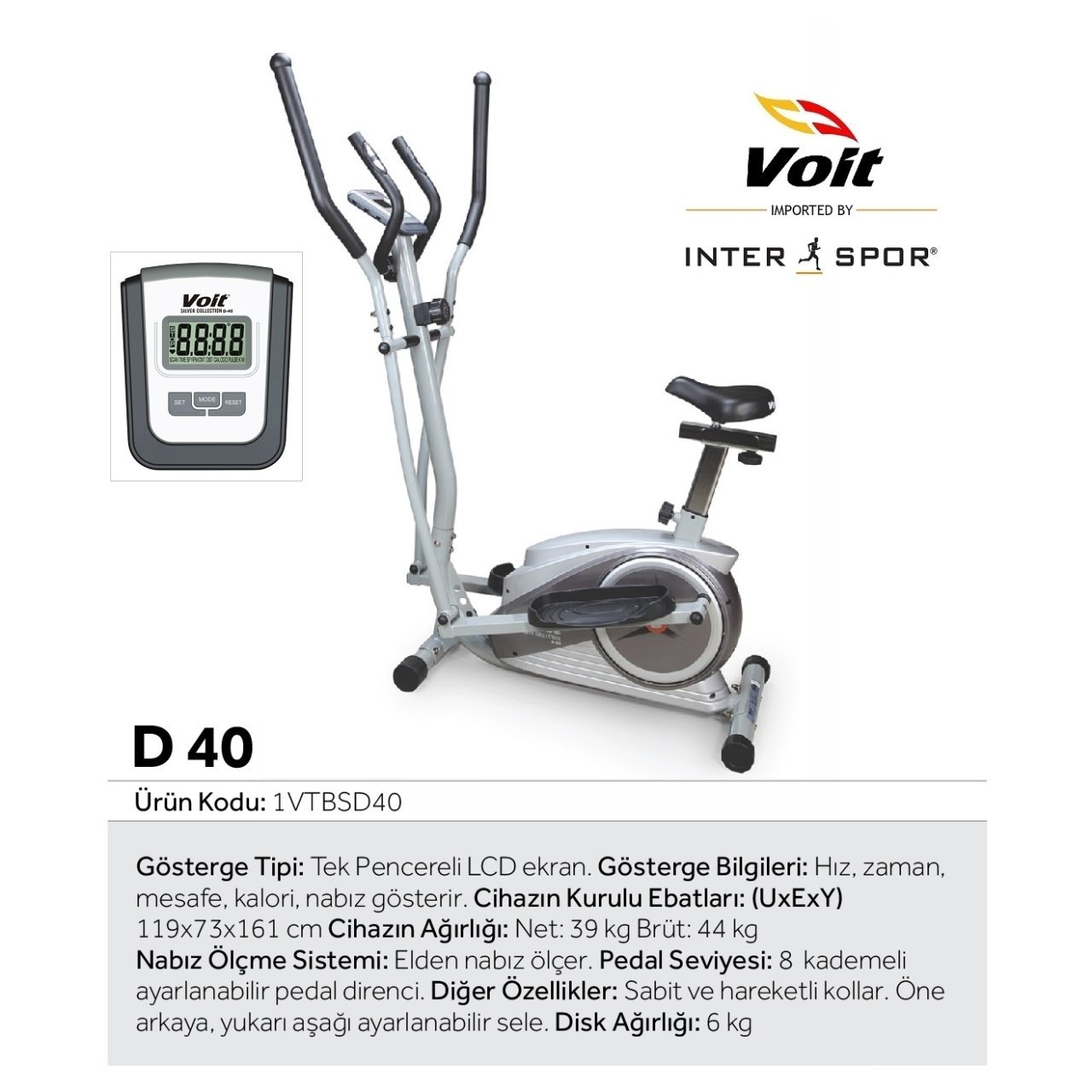 Voit D40 Silver Collection Eliptik Bisiklet Ürün Özellikleri : Voit D40 Silver Collection Eliptik Bisiklet Gösterge Bilgileri : Antrenman esnasında ulaşabileceğiniz; Hız, zaman, mesafe, kalori ve nabız bilgileri bulunmaktadır. Voit D40 Silver Collection Eliptik Bisiklet Gösterge Tipi : Tek pencereli LCD ekranı vardır Kurulu Ölçüleri : 119x73x161 cm Ağırlığı : Net: 36 kg Brüt: 41 kg Voit D40 Silver Collection Eliptik Bisiklet Pedal Sistemi : 8 seviyeli ayarlanabilir pedal direnci Diğer Özellikler : Disk Ağırlığı : 5 kg'dır Selesi öne arkaya ve yukarı aşağı ayarlanabilir Sporunuzu yaparken elden nabız ölçer Çalışma Prensibi : Manyetiktir (Manyetik direnç özelliği olan cihazlarda disk ile çalışma sistemi mevcut olup, sporunuz esnasında yapılan hareketler daha akıcı ve tamamen sessizdir.) en sessiz eliptik bisiklet Voit Bisikletleri'nin 2 Yıl garantisi vardır. Ücretsiz Kargo (Tüm Türkiye) Ücretsiz Kurulum (Tüm Türkiye) 81 İlde 114 Noktada Teknik Servis
