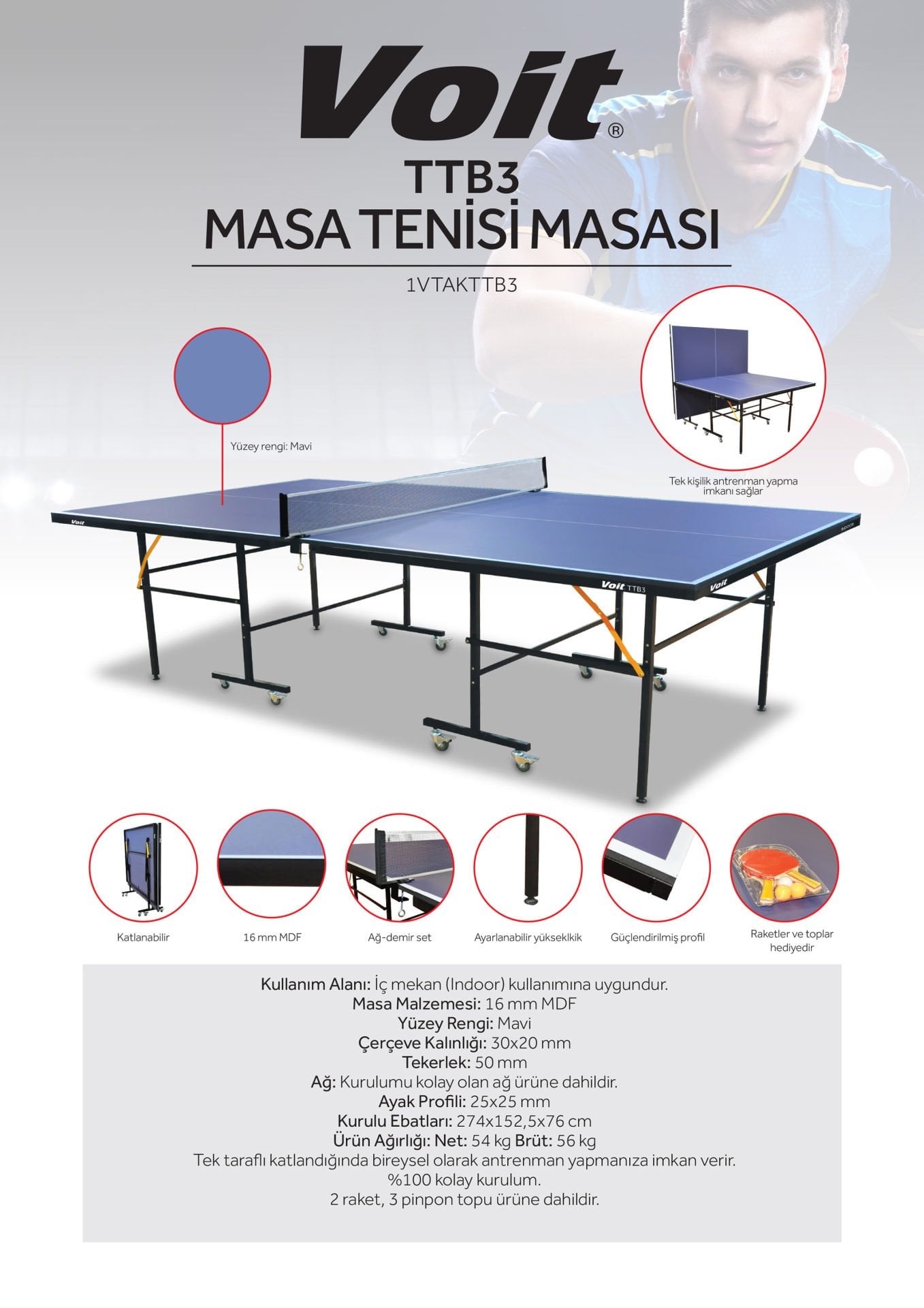 2 raket, 3 pinpon topu ürüne dahildir.